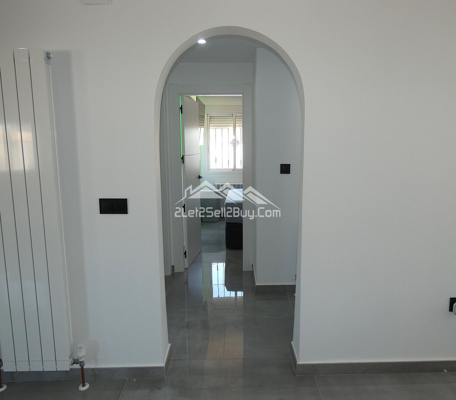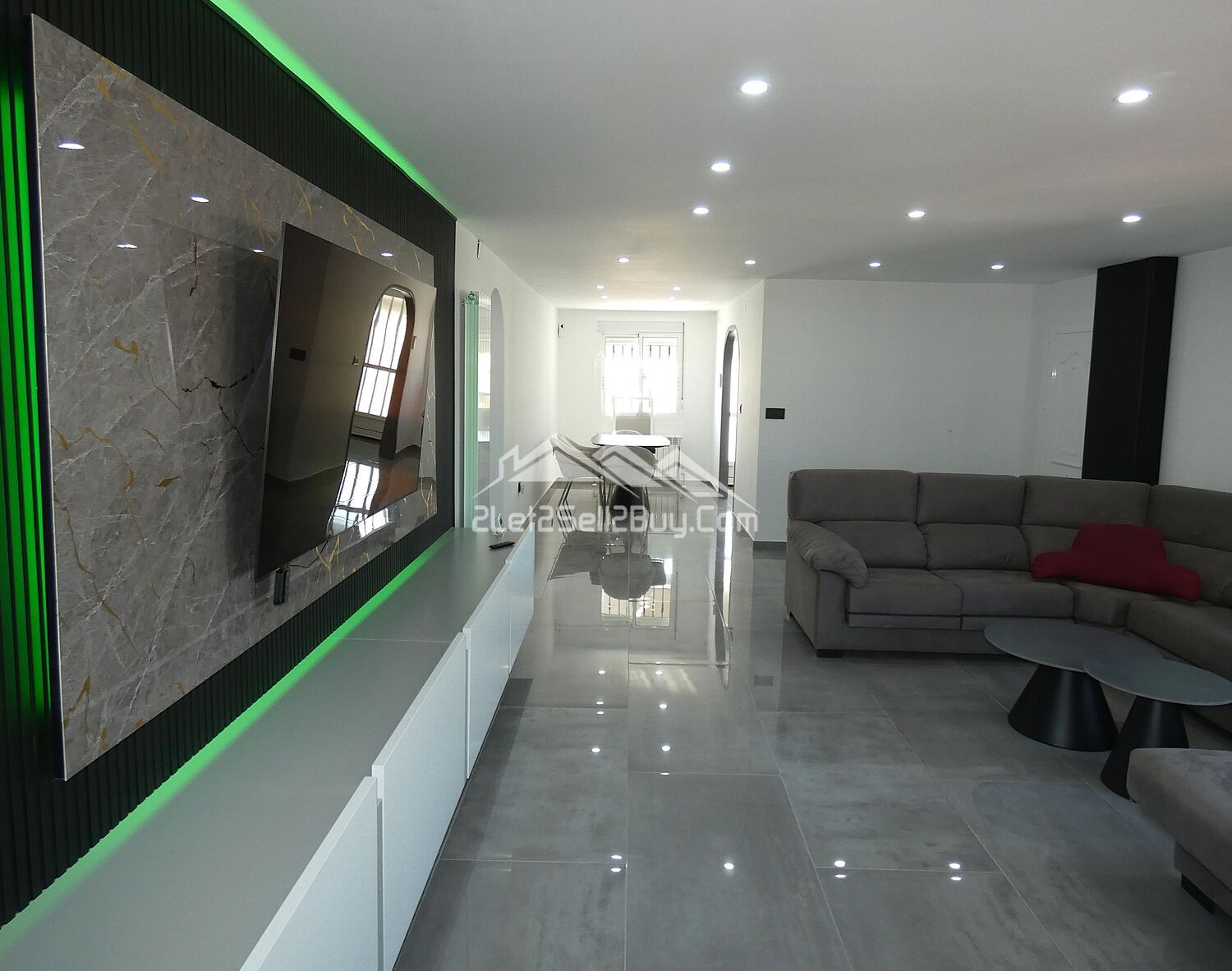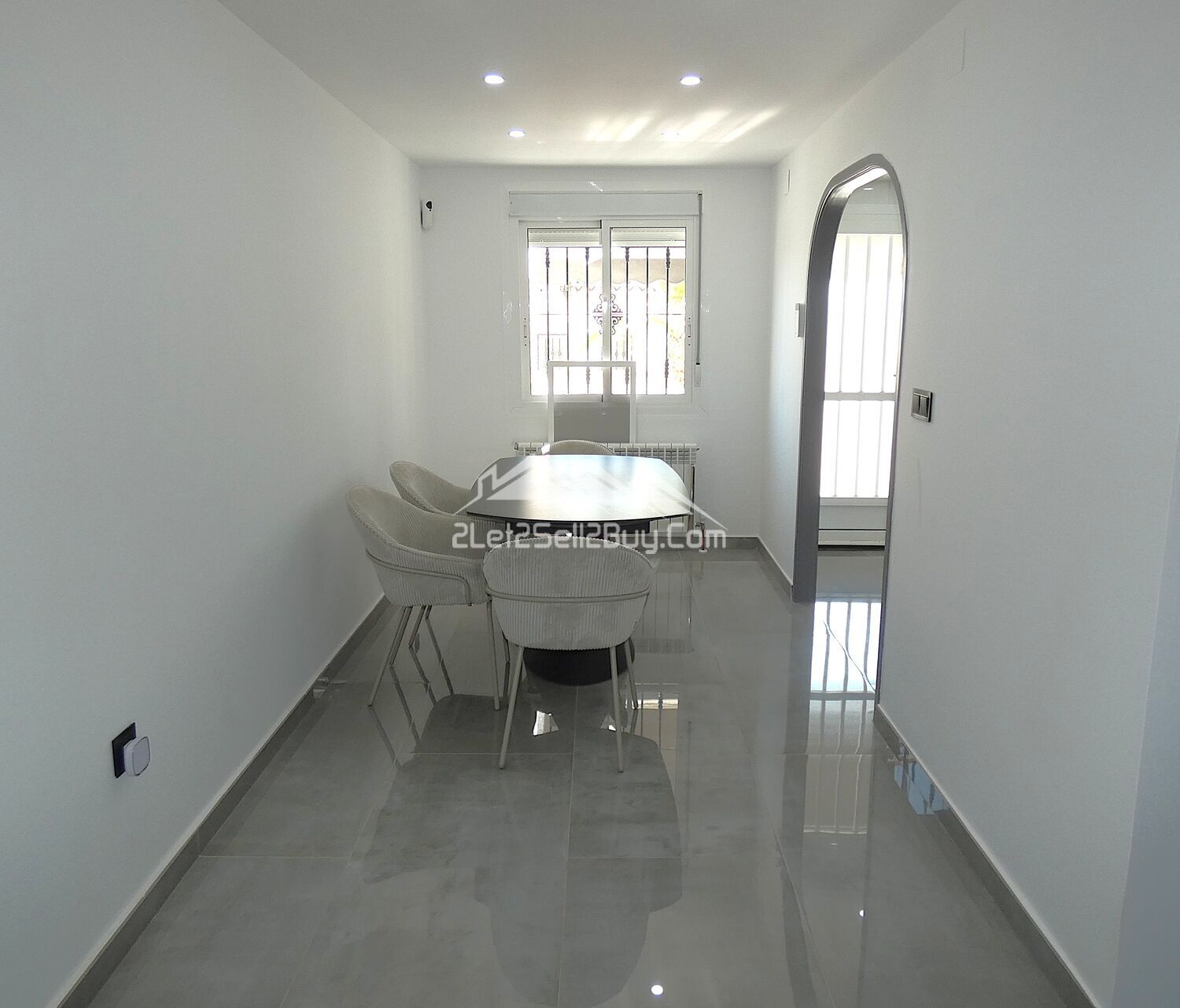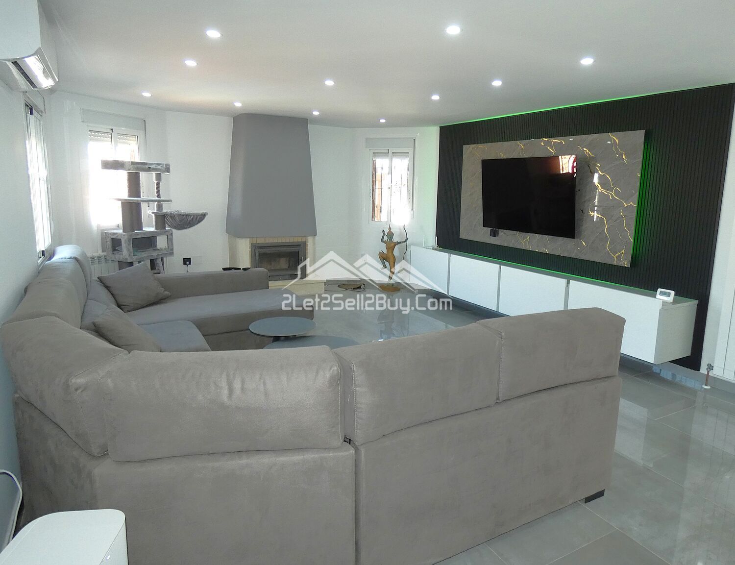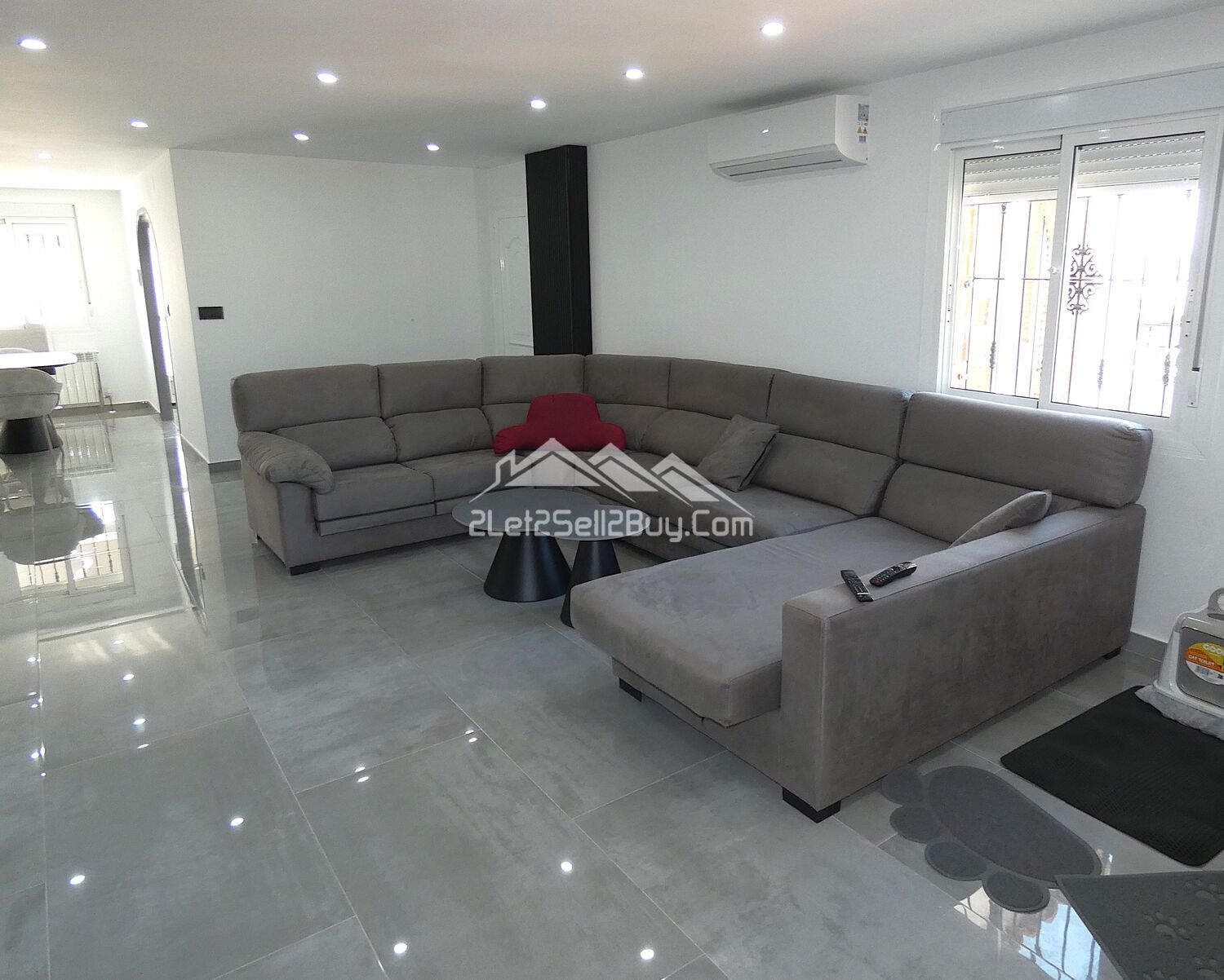The vestibule leads directly into the lounge. This is a bright and contemporary room, white walls are complemented by high gloss grey tiling throughout, with a striking media wall with LED lighting and the addition of multiple spotlights, creating a light and versatile interior. A log burner, dual A.C, and wall mounted radiators provide comfort throughout. Dual aspect windows fitted with insect screens, blackout blinds and rejas allow natural light to illuminate the room. Three of the bedrooms and the family shower room are accessed via a small hallway from the lounge.