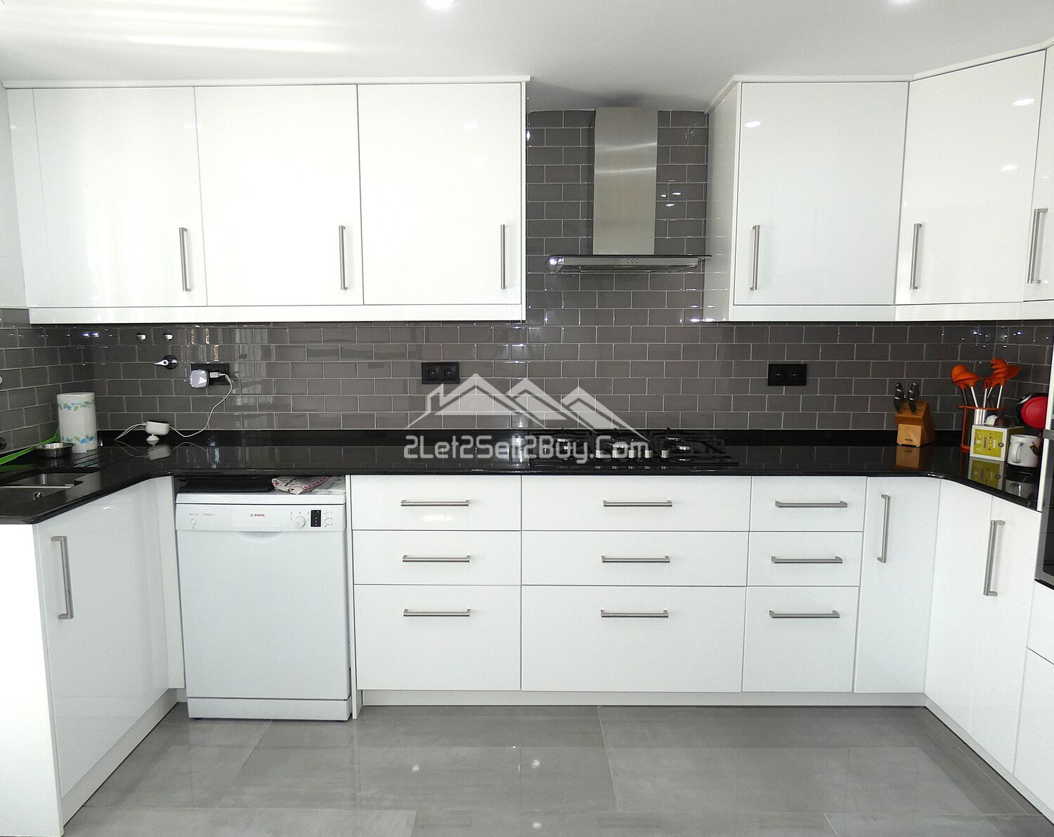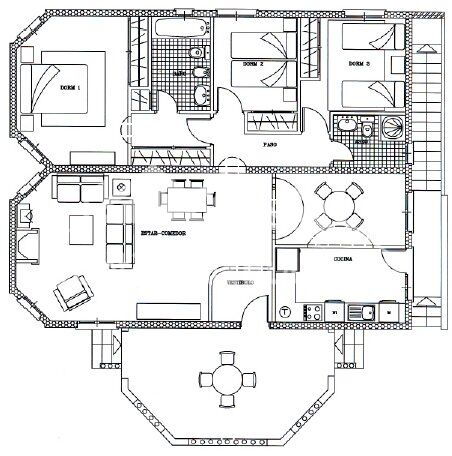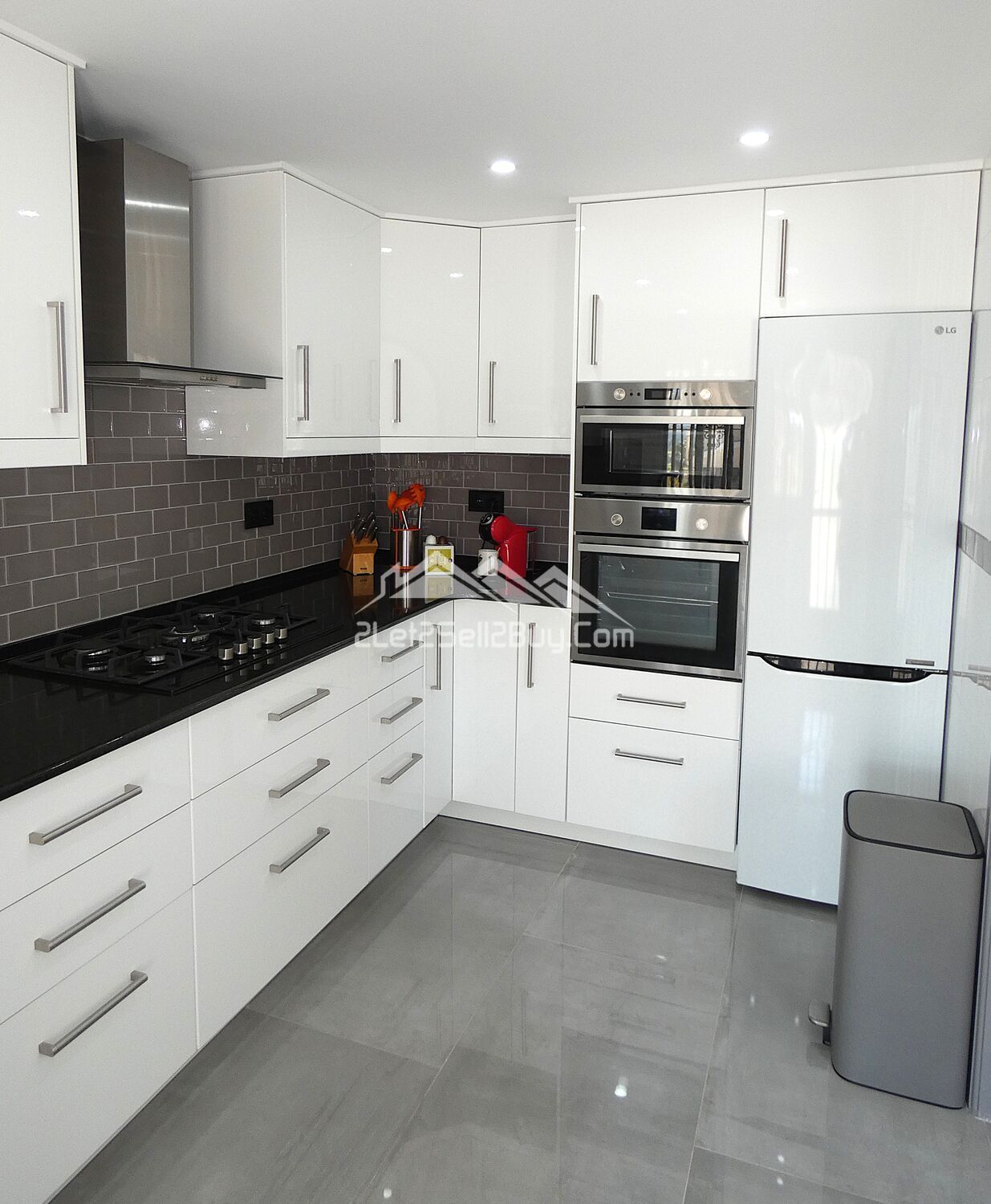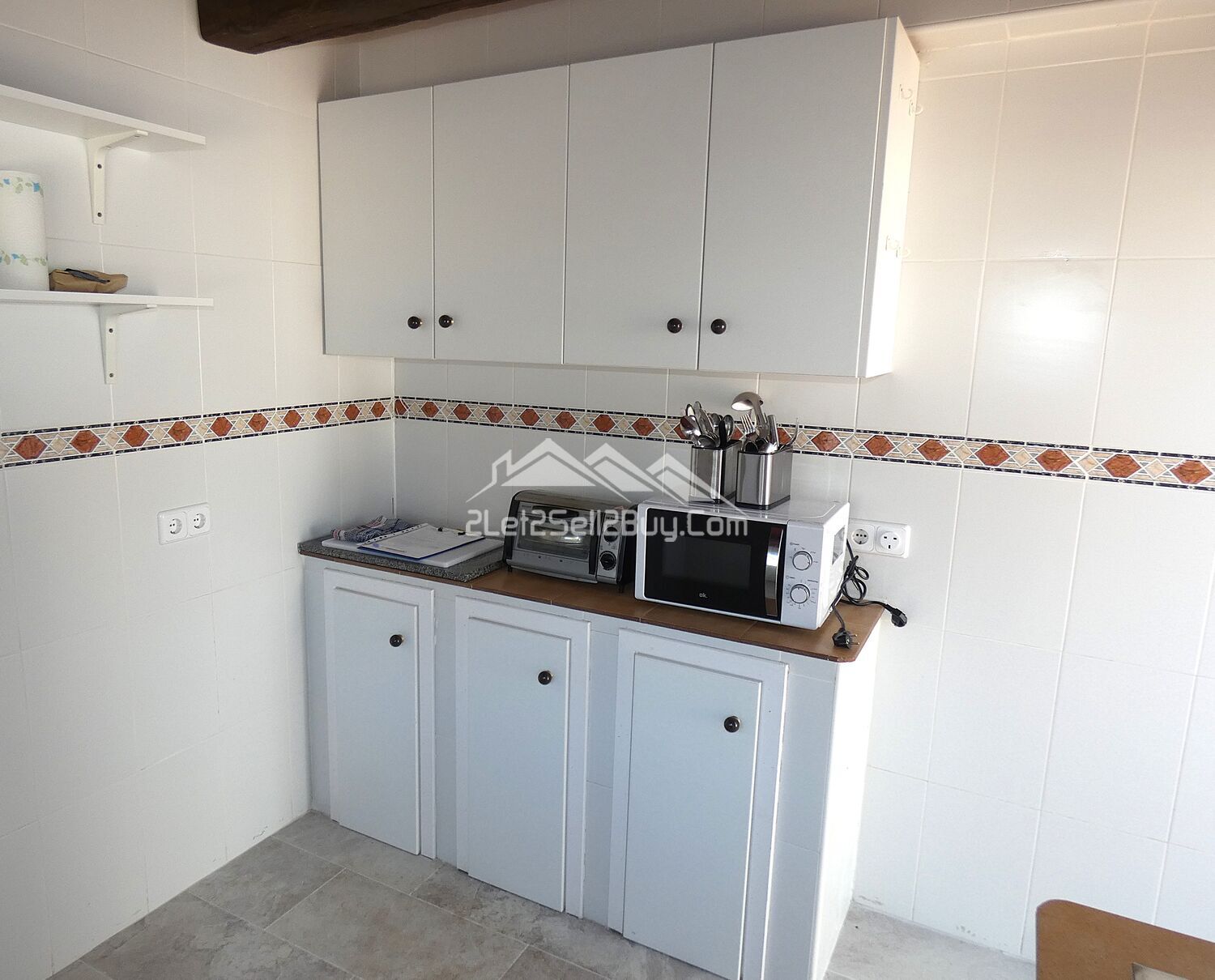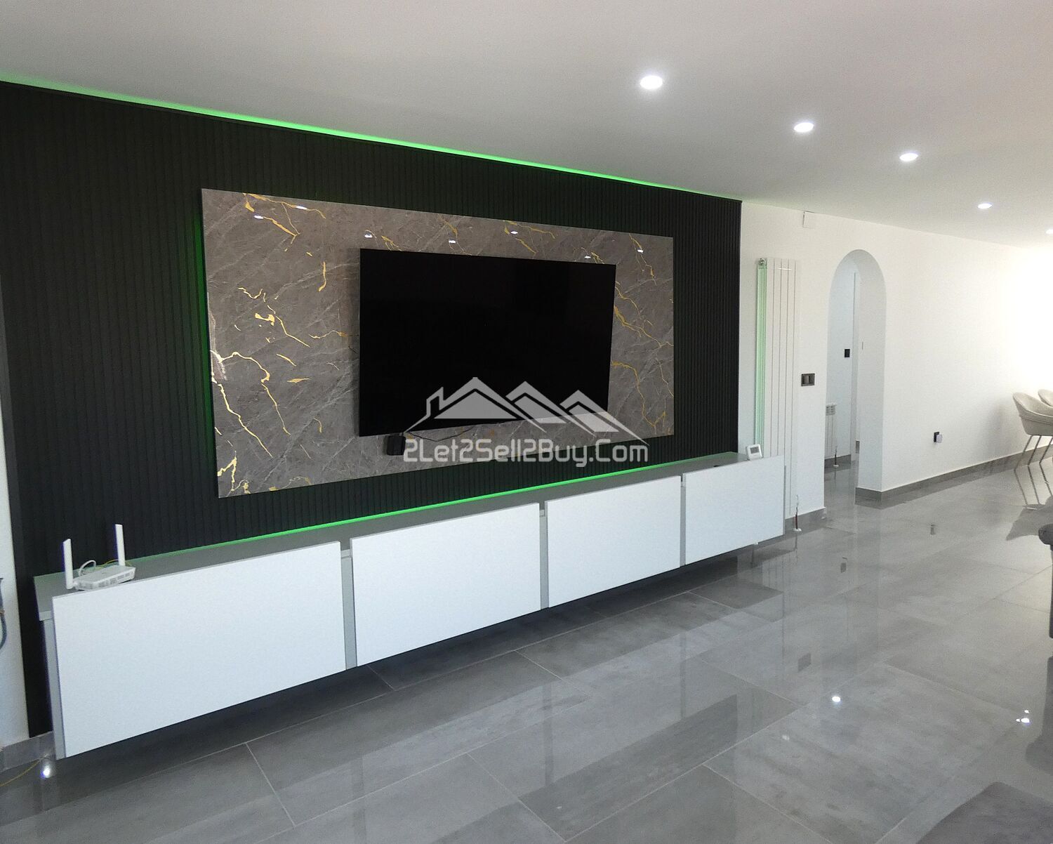 The vestibule leads directly into the lounge. This is a bright and contemporary room, white walls are complemented by high gloss grey tiling throughout, with a striking media wall with LED lighting and the addition of multiple spotlights, creating a light and versatile interior. A log burner, dual A.C, and wall mounted radiators provide comfort throughout. Dual aspect windows fitted with insect screens, blackout blinds and rejas allow natural light to illuminate the room. Three of the bedrooms and the family shower room are accessed via a small hallway from the lounge.