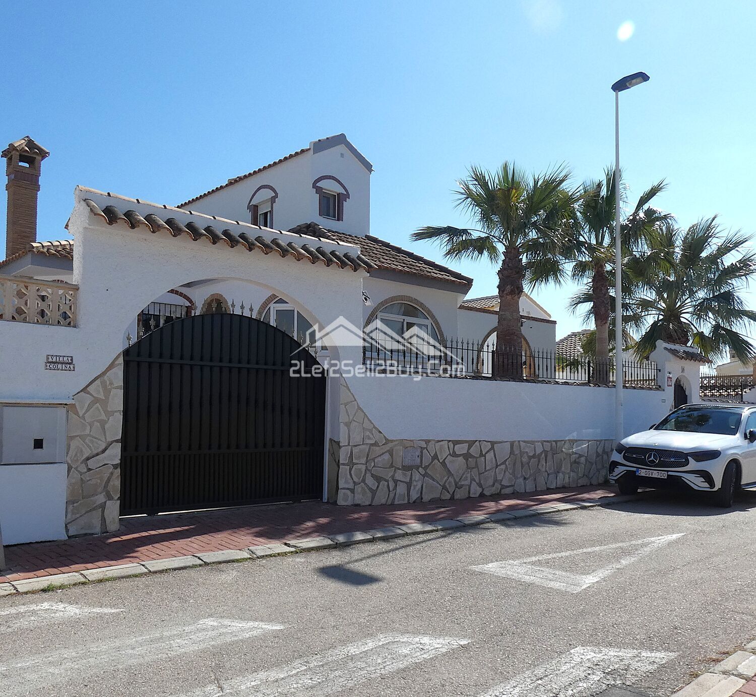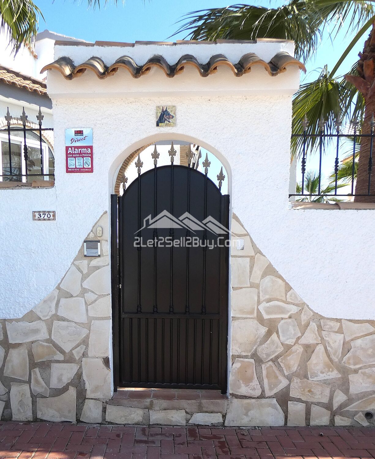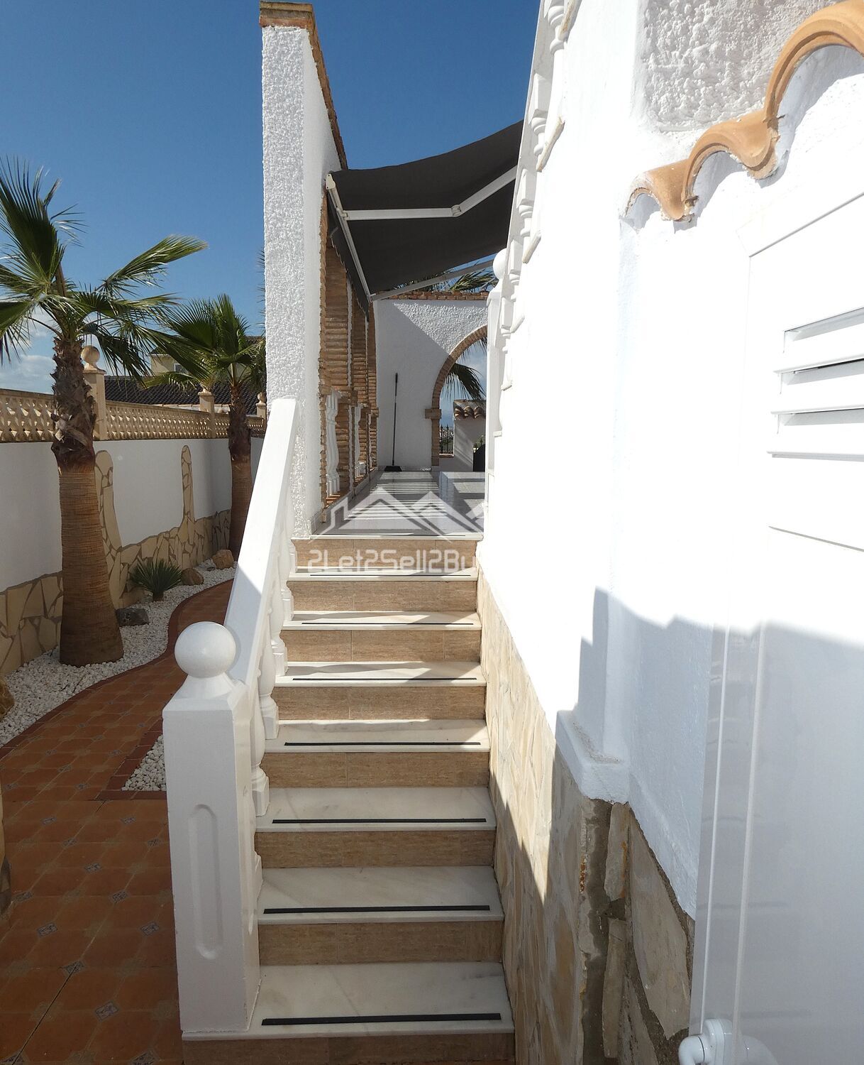 A decorative metal gate provides pedestrian access to the front of the property. To both sides, neatly presented gardens are laid with shale beds for ease of maintenance and thoughtful planting including an abundance of palms and vibrant shrubs. The area is fully tiled, and directly ahead marble steps with decorative handrails and balustrades lead up to the front terrace.