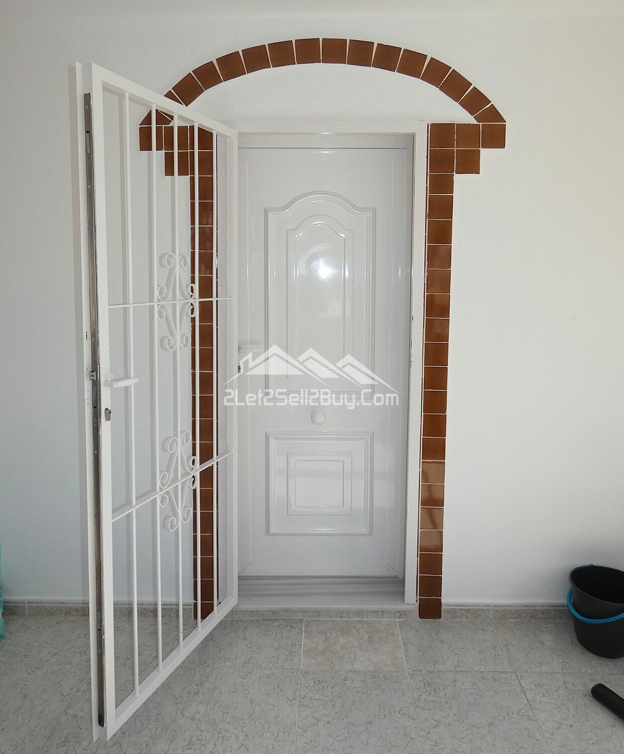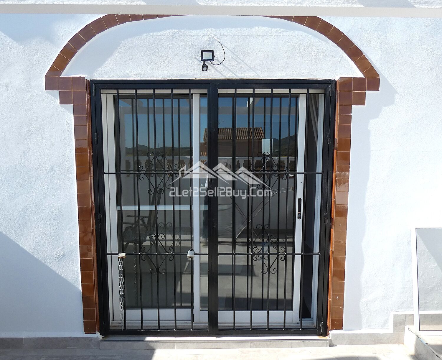 To the left, glazed French doors open into the fully glazed terrace with opening windows creating additional year-round living space. This is a charming room; bright and sunny featuring arches dressed in valentine bricks which frame the stunning views to the garden and the countryside beyond, a ceiling light and fan and wall mounted radiator provide year-round comfort. A modern, white security door with reja opens into a small vestibule.