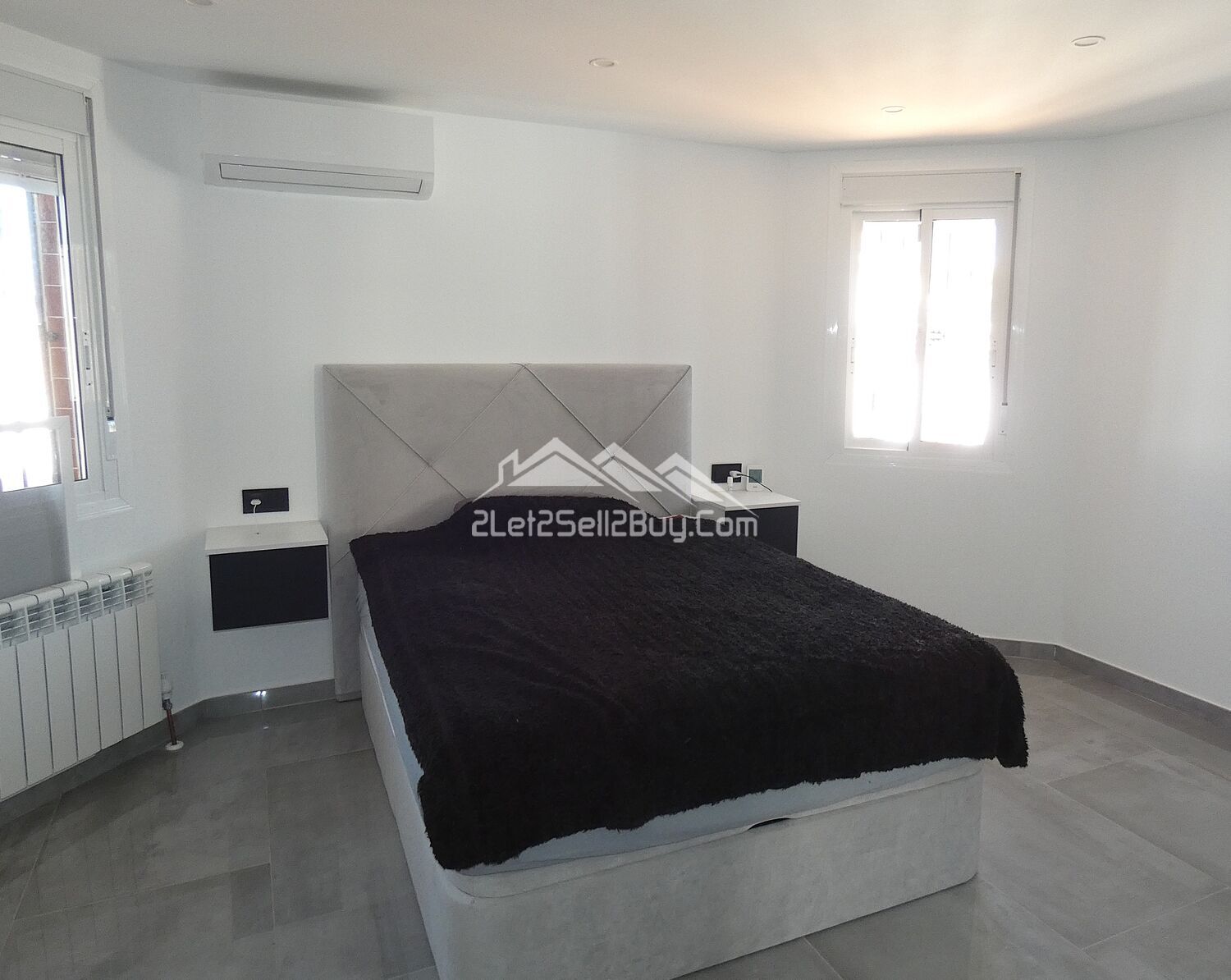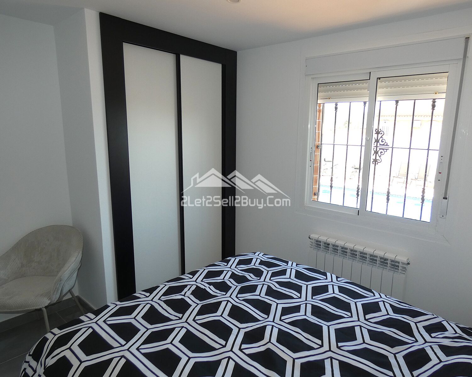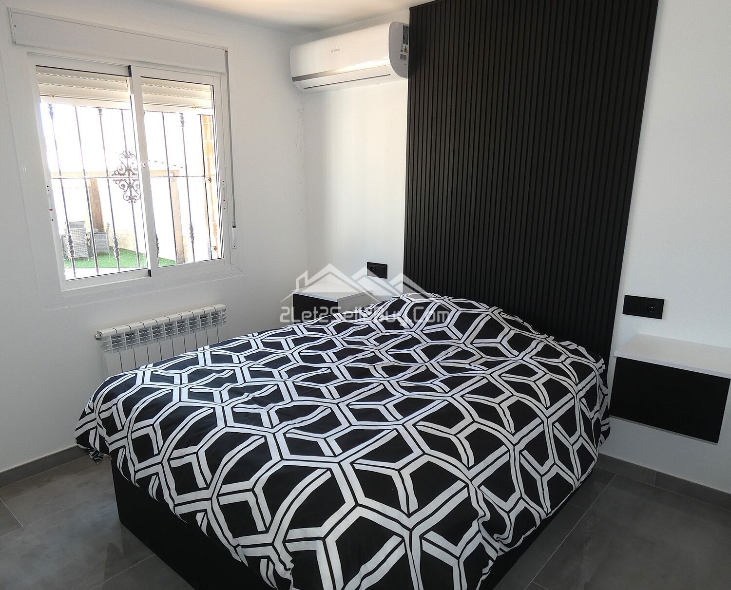 The second bedroom is located along the hallway, a double room, stylishly decorated in a grey and white colour scheme with a black feature wall, ceiling spot lights, dual A.C, and wall mounted radiator provides year round comfort, and a built-in wardrobe with modern sliding doors provides an excellent storage solution, a large window fitted with insect screen, blackout blind and reja looks to the rear of the villa.