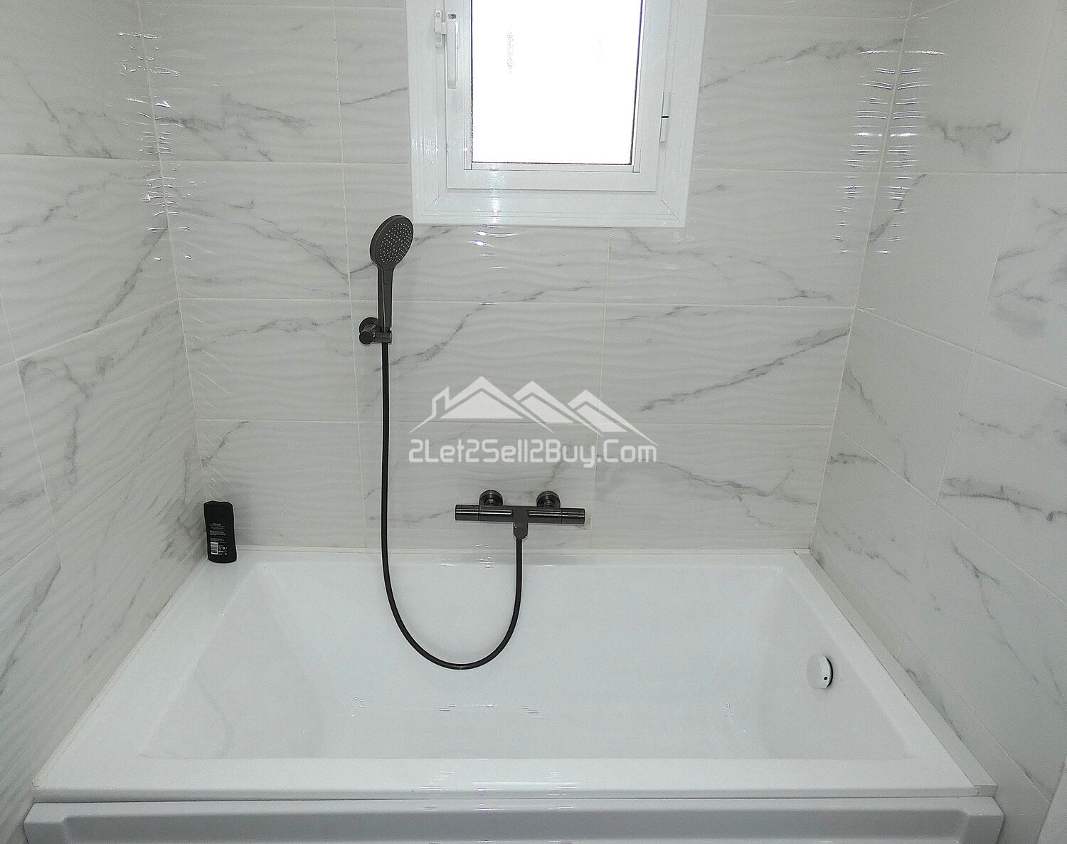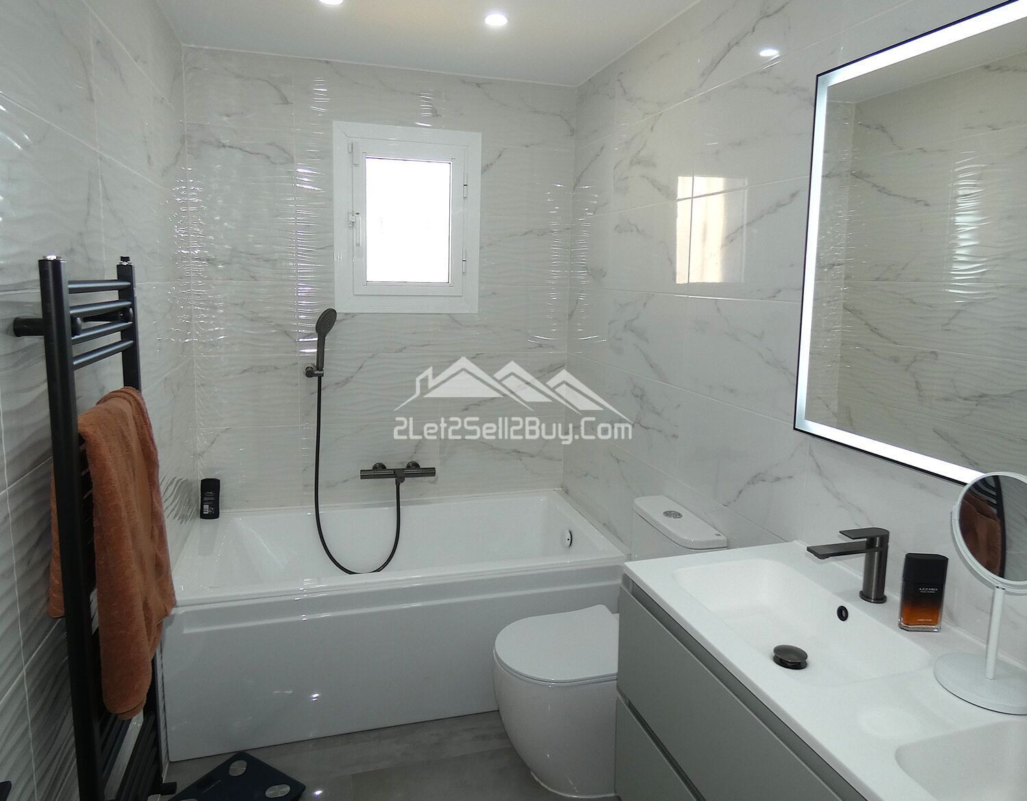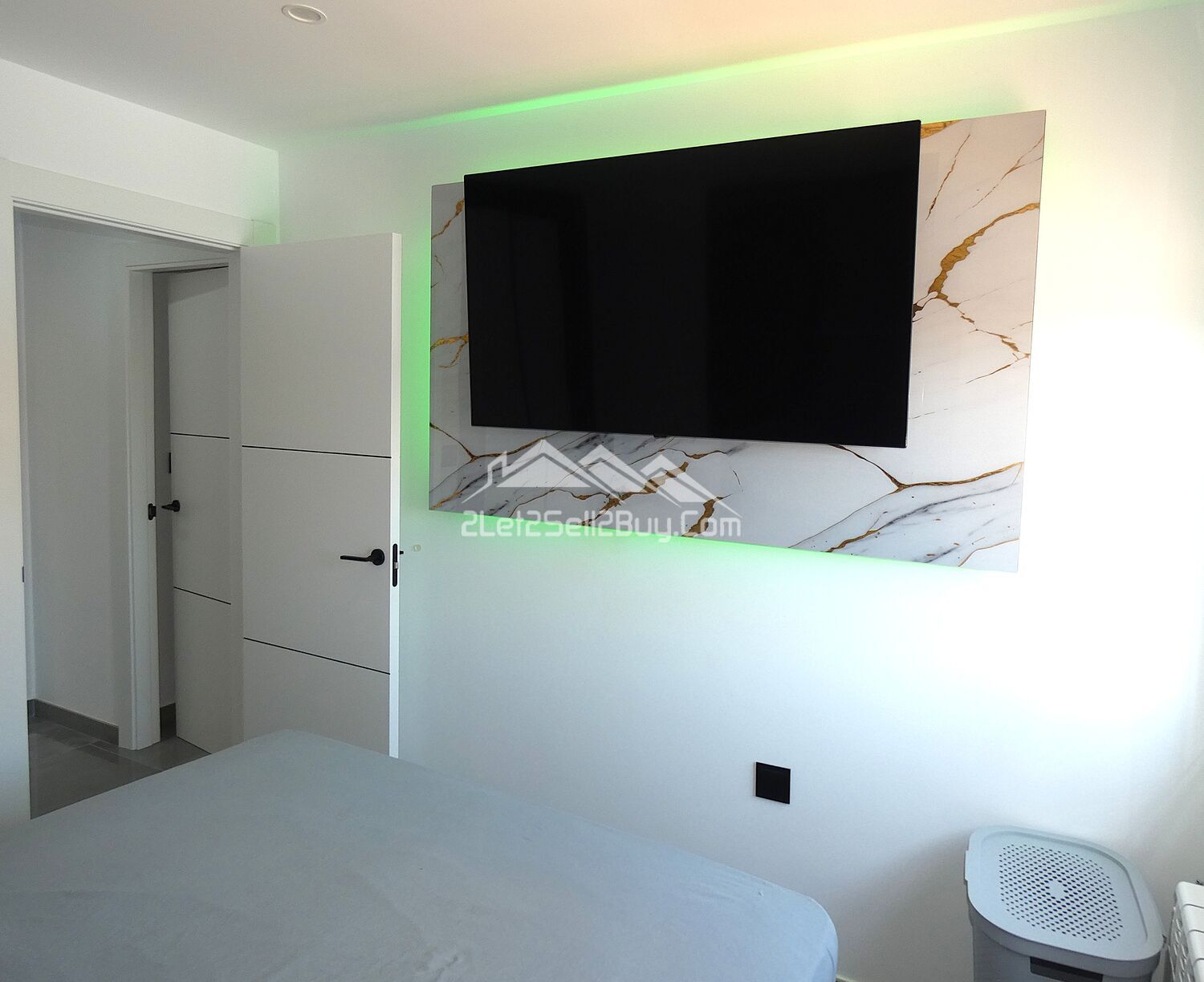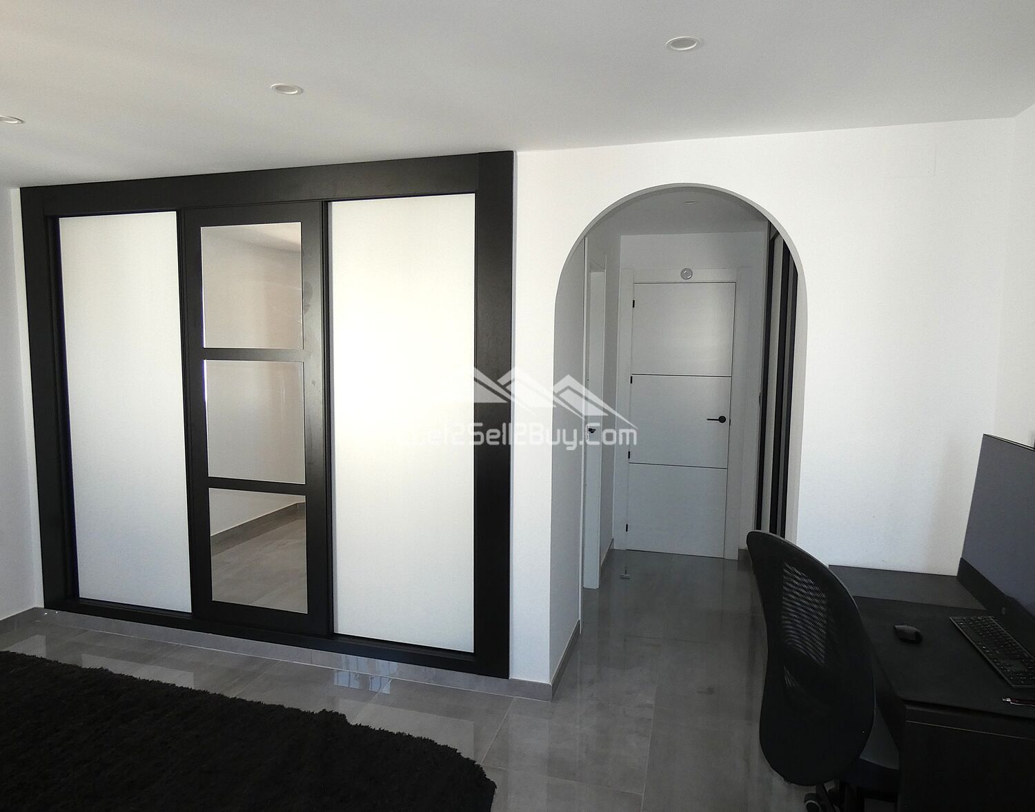 The second bedroom is located along the hallway, a double room, stylishly decorated in a grey and white colour scheme with a black feature wall, ceiling spot lights, dual A.C, and wall mounted radiator provides year round comfort, and a built-in wardrobe with modern sliding doors provides an excellent storage solution, a large window fitted with insect screen, blackout blind and reja looks to the rear of the villa.