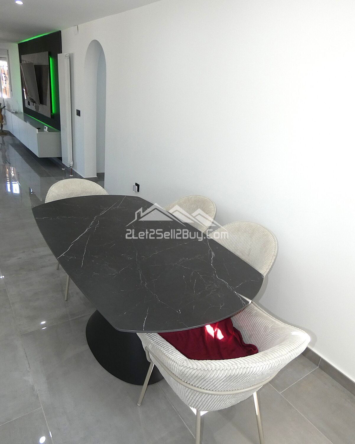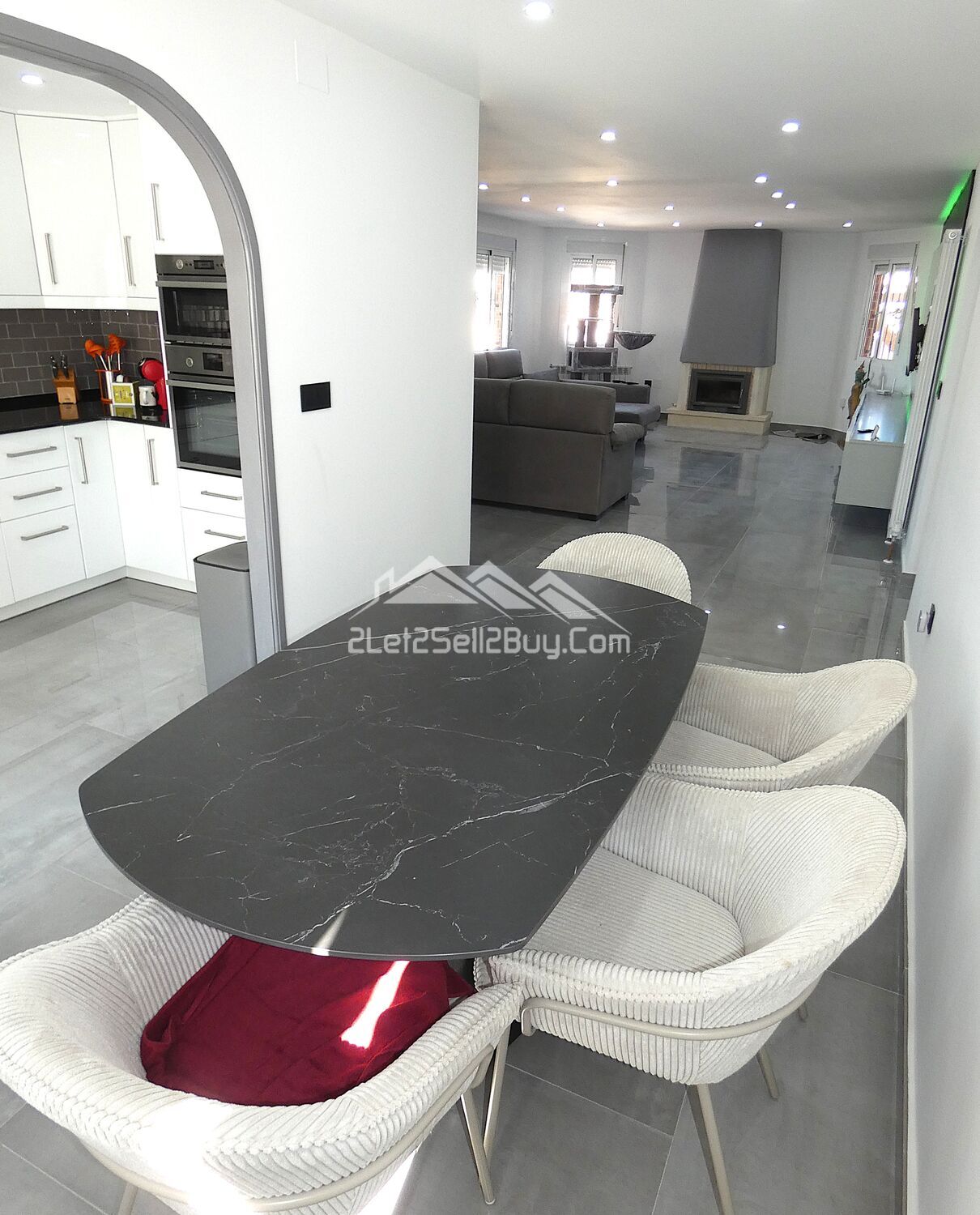 The dining room is accessed via the lounge, continuing the villa's crisp, contemporary theme, with space to comfortably seat a large family gathering. A window overlooks the side of the property. A large archway leads to the kitchen.