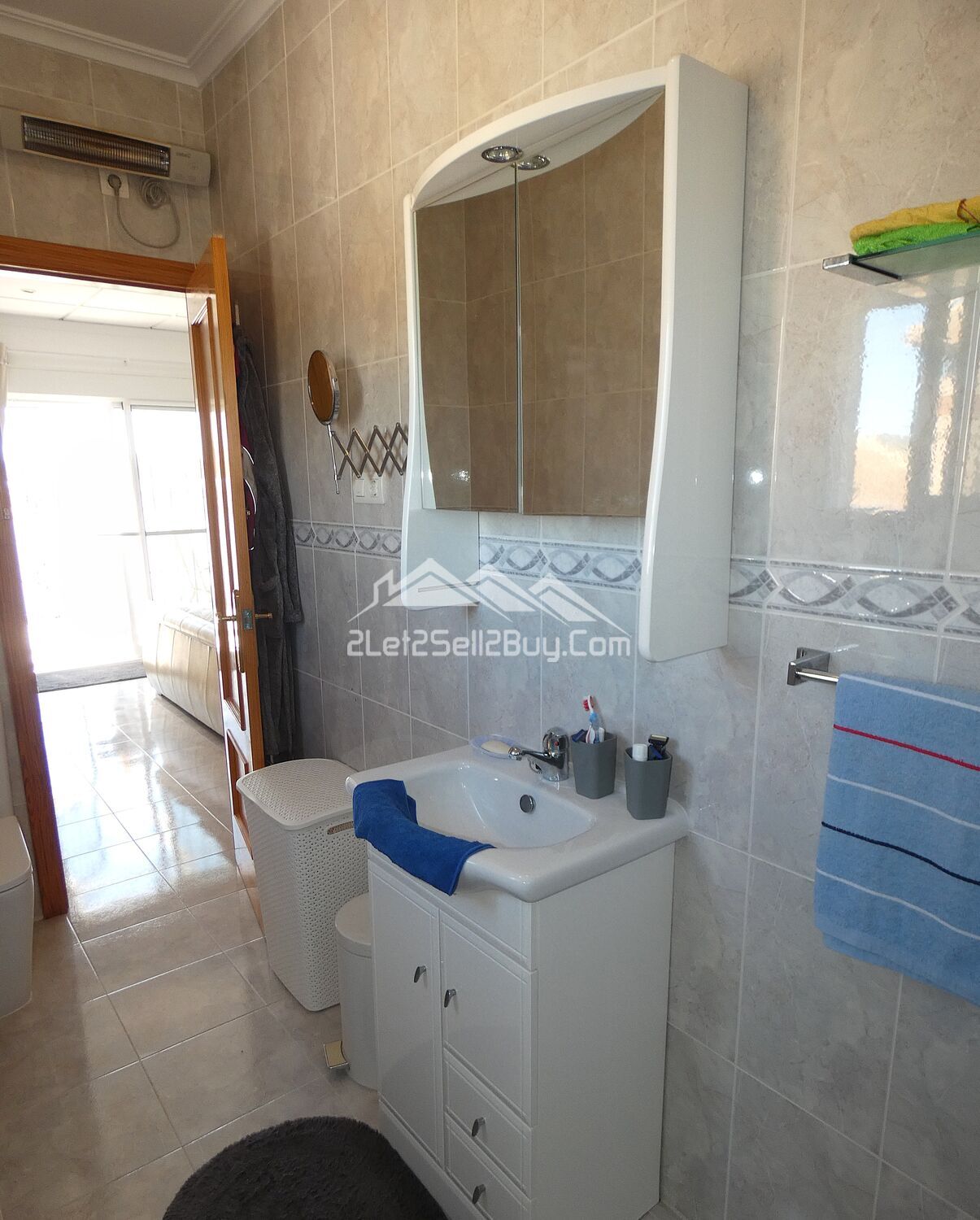 The master bedroom is located to the left and is a generously proportioned double, easily accommodating a king-size bed. It benefits from three large built-in wardrobes offering excellent storage with floor to ceiling newly fitted sliding doors with central mirror, along with ample space for free-standing furniture. Wall mounted radiators, and dual AC provide comfort and spotlights to the ceiling illuminate the room. Finished with crisp white walls and grey tiled floors, the room provides a relaxing retreat. Two windows, fitted with insect screens, blackout blinds, and rejas, enjoy pleasant views over the garden, while a door offers access to the en-suite shower room.