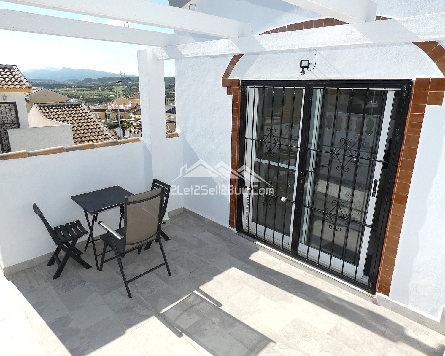 The ensuite is fully tiled in a neutral colour scheme and incorporates a walk-in shower with sliding white glass doors, vanity unit and sink, wall mounted mirror with light, and a wall mounted heater. A window with blackout blind and reja overlooks the countryside and provides ventilation. The solarium offers additional outdoor space ideal for relaxing, or entertaining, with fabulous views to the countryside and the mountains beyond in addition to the golf club, a great spot to install a hot tub.