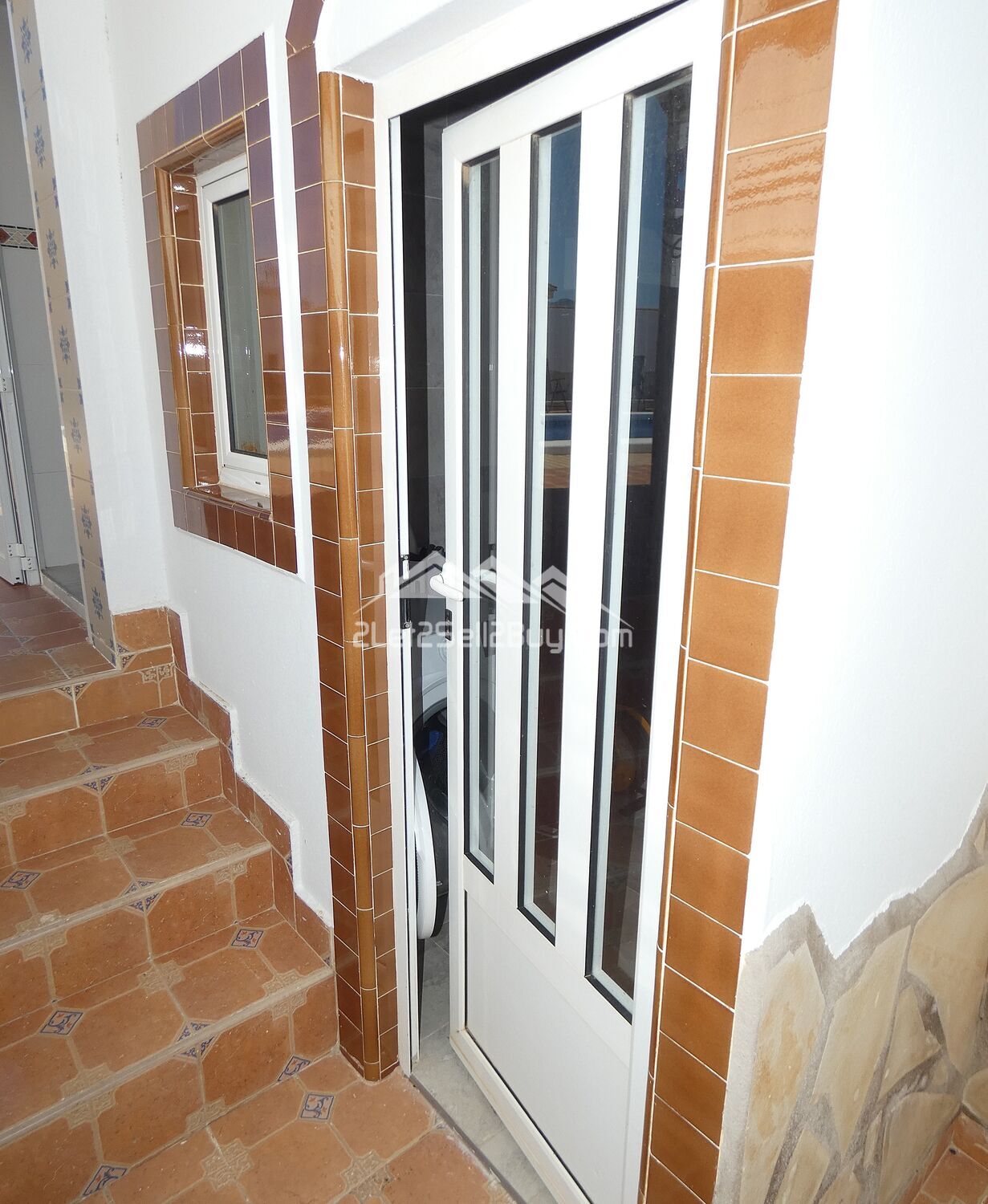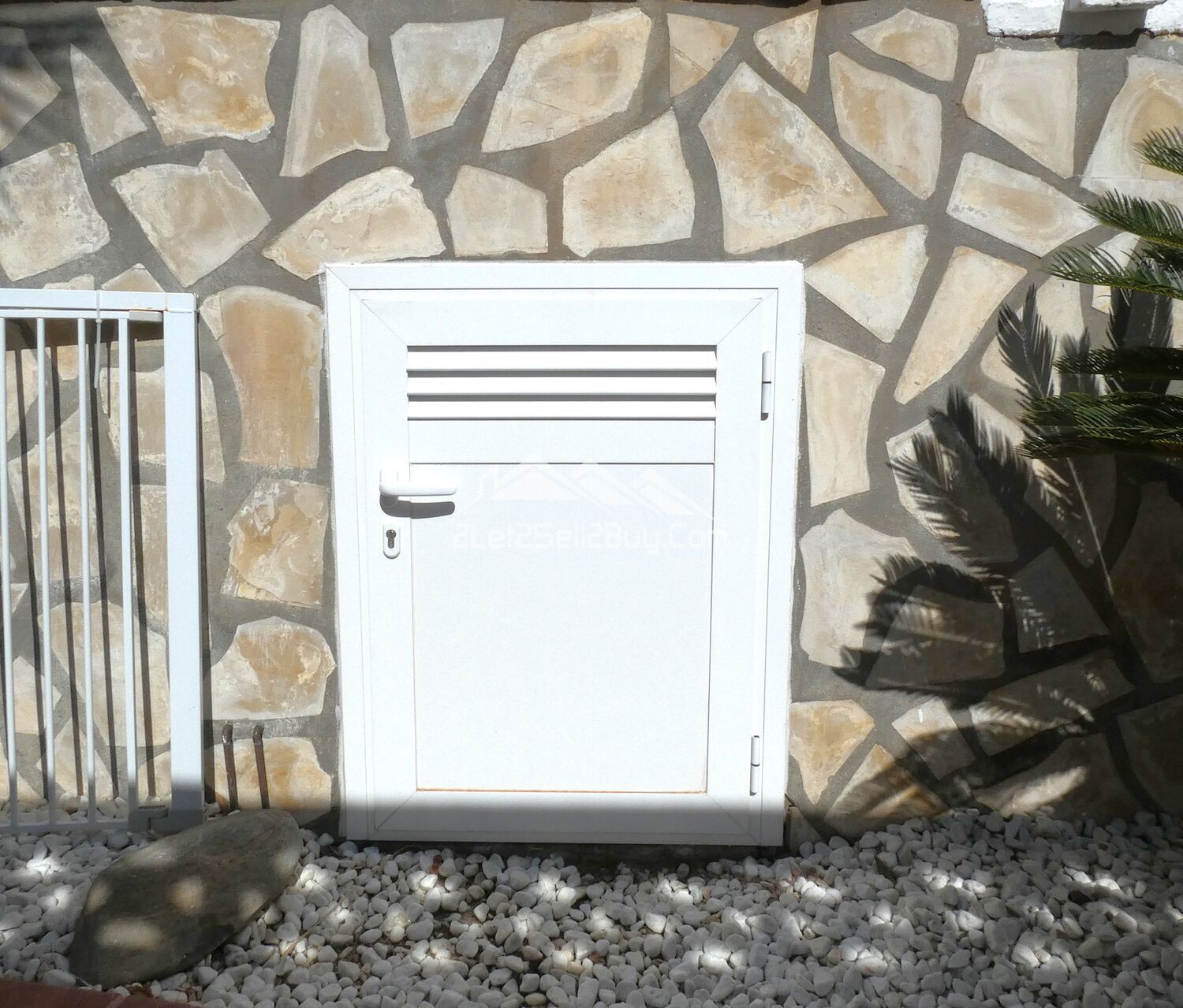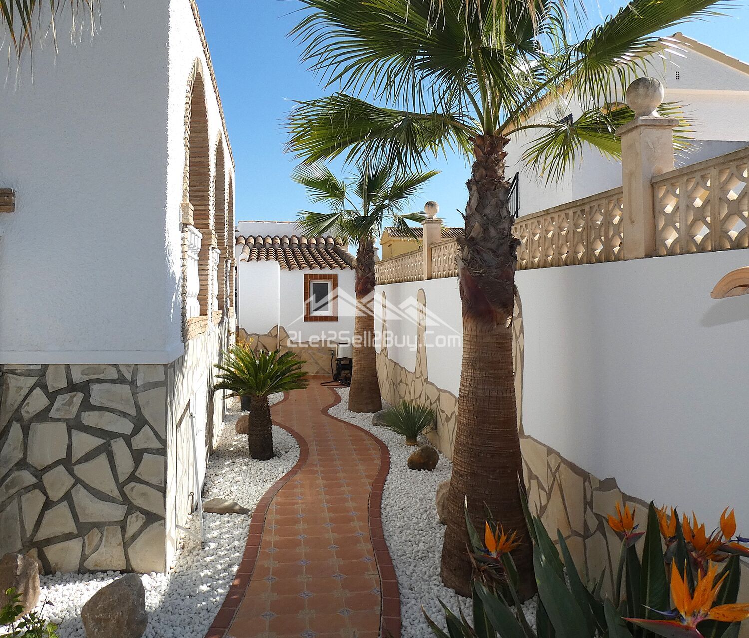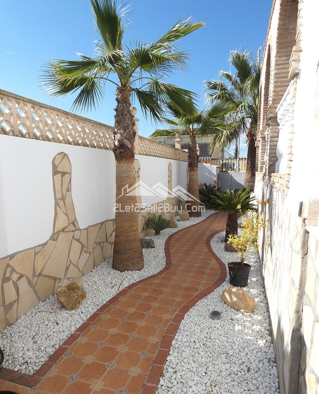 A pretty tiled pathway meanders round the side of the villa and is bordered by shale with mature palm trees and planting leading to a part glazed door and a useful utility room and bathroom.