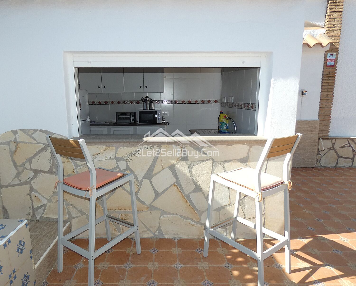 The summer kitchen and bar are a fabulous addition to the rear of the property. Fitted with lighting, fully tiled, and includes base and wall mounted units with contrasting tiled worktops, stainless steel double sink and drainer, and space for a fridge freezer. A sliding roller shutter with serving hatch looks through to the outdoor seating and pool area.