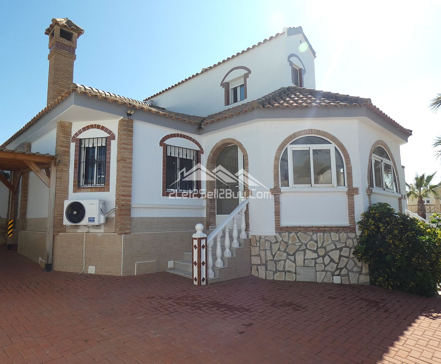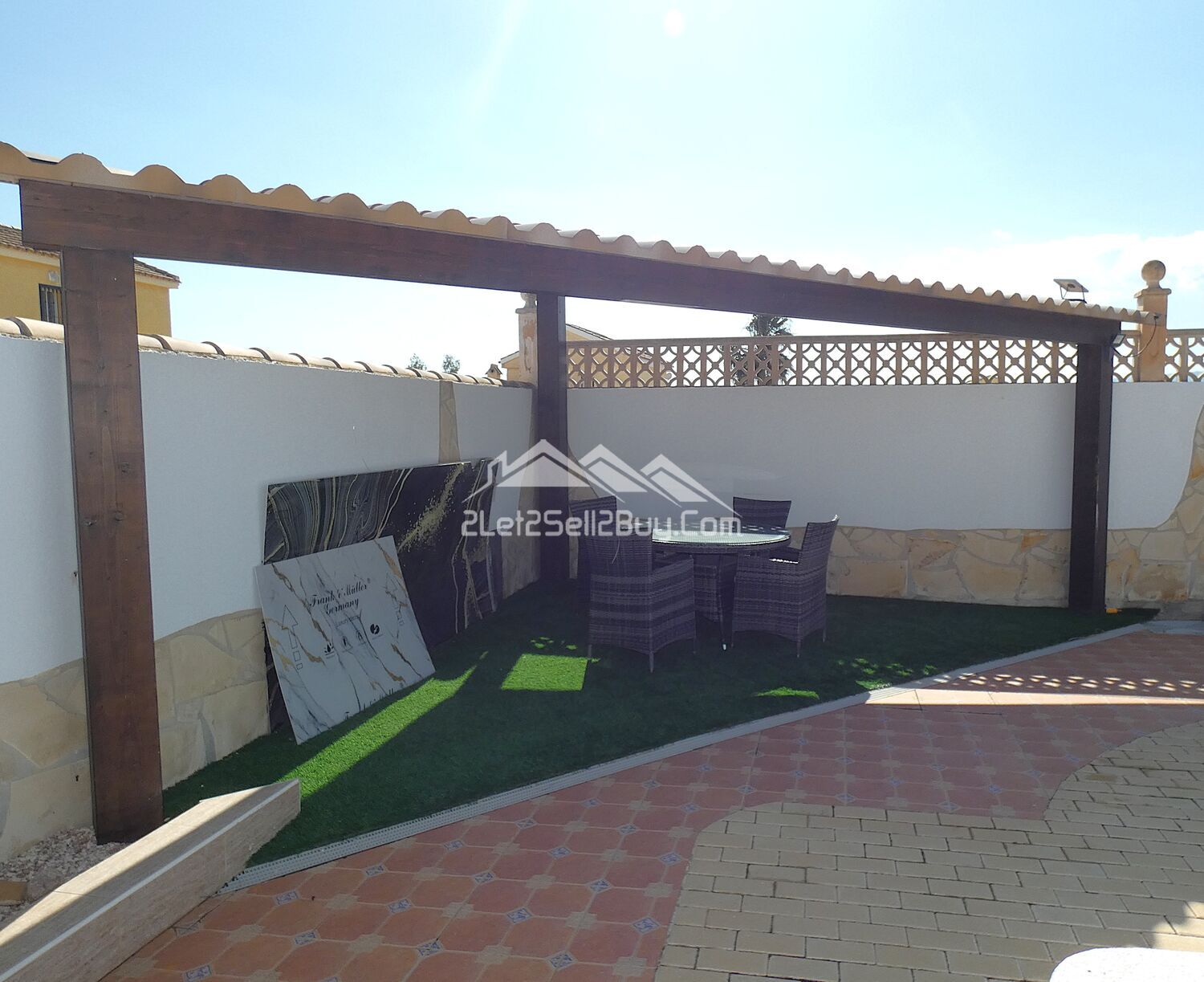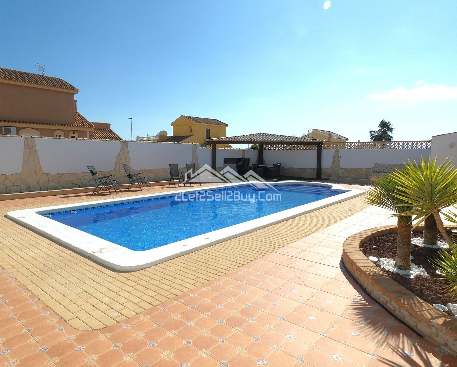 A tiled dining and seating area has been created and is a great entertaining space with room for a dining table and chairs; tiled seating areas create a relaxation area to take in the Murcia sunshine while sipping a cocktail made at your own bar. Taking centre stage is the fabulous 10x5 private pool with Roman steps for easy access and surrounded with raised decorative walls for privacy, an outdoor solar shower is to the left of the pool, and with a wooden pergola for shaded seating is situated in the corner. Beautiful, raised beds edge the wall and are planted with mature palm trees and bushes. A paved pathway leads through an ornamental arch back round to the carport and the drive.