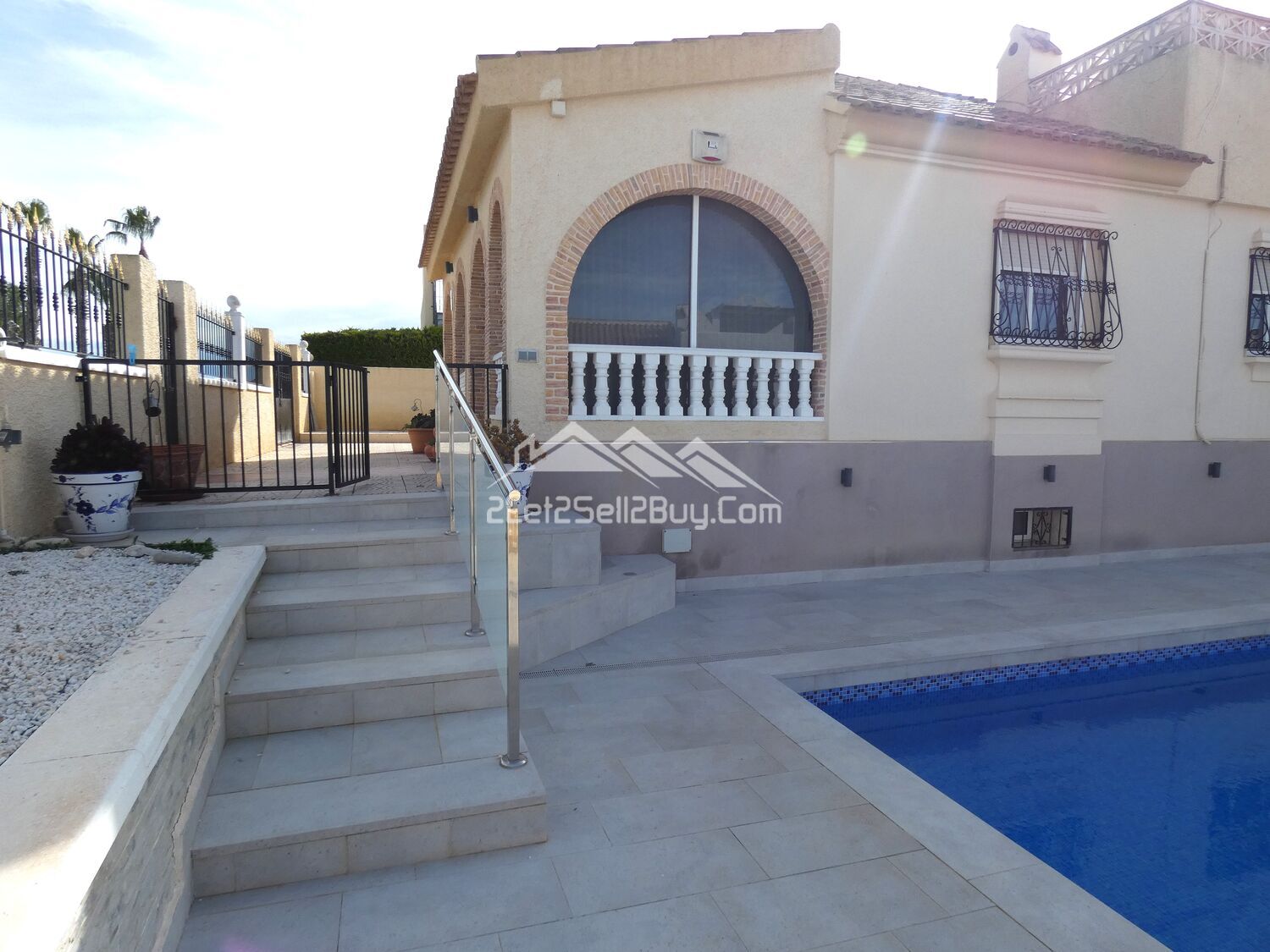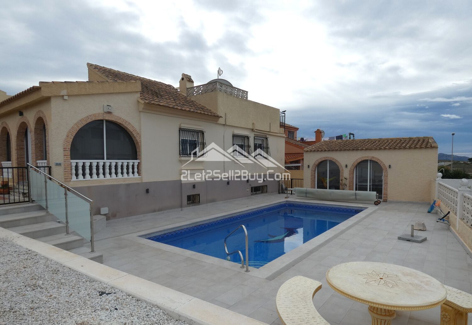 A well-presented extended Rosa Style Villa, 2 bed, 2bath, 400m2 plot, off-road parking, garage, enclosed terrace, dual A.C, upgraded kitchen and bathrooms, 9x4 heated pool, pool house, developed under build, oil CH, external wall insulation, roof-top solarium, fabulous views. Being sold part furnished.