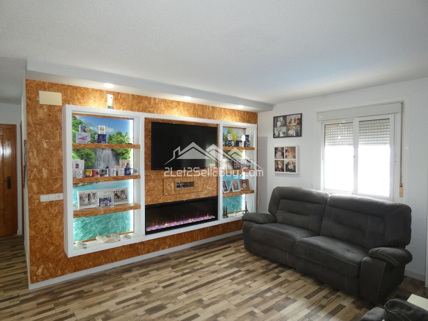 Dual air conditioning units and wall-mounted radiators ensure year-round comfort, while spotlights add a welcoming ambience. A tiled, wood-style floor completes the look. Dual-aspect windows, fitted with insect screens and blackout blinds, allow natural light to flood the room. To the left, a double decorative archway leads through to the dining and kitchen area.