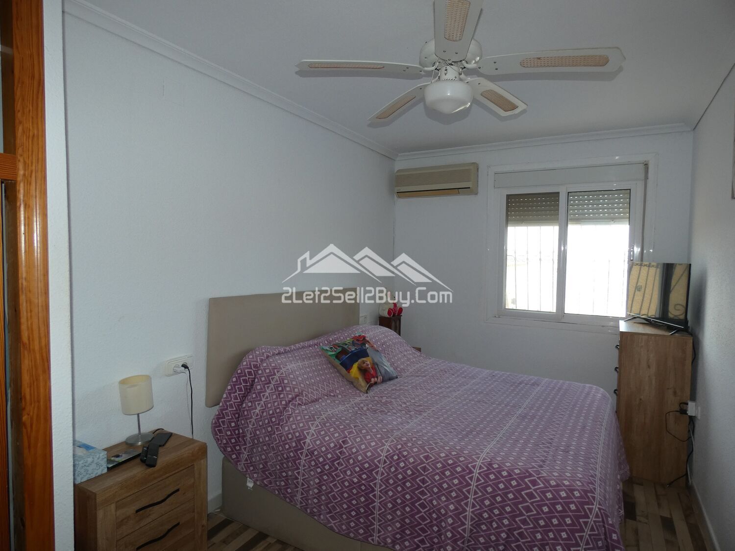 Returning to the lounge, a hallway leads to the two bedrooms and the family shower room. The first bedroom, located to the left, is a well-proportioned double, currently arranged as a single with dedicated office space. It features a ceiling fan with light, dual air conditioning units and a wall-mounted radiator for year-round comfort and a stylish tiled wooden effect floor. A built-in wardrobe with overhead storage provides a practical storage solution, while a window fitted with an insect screen, blackout blind and reja allows for natural light.