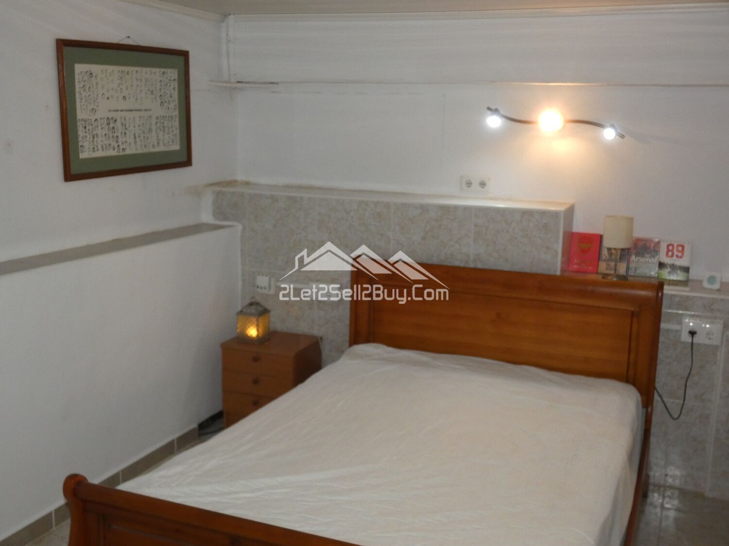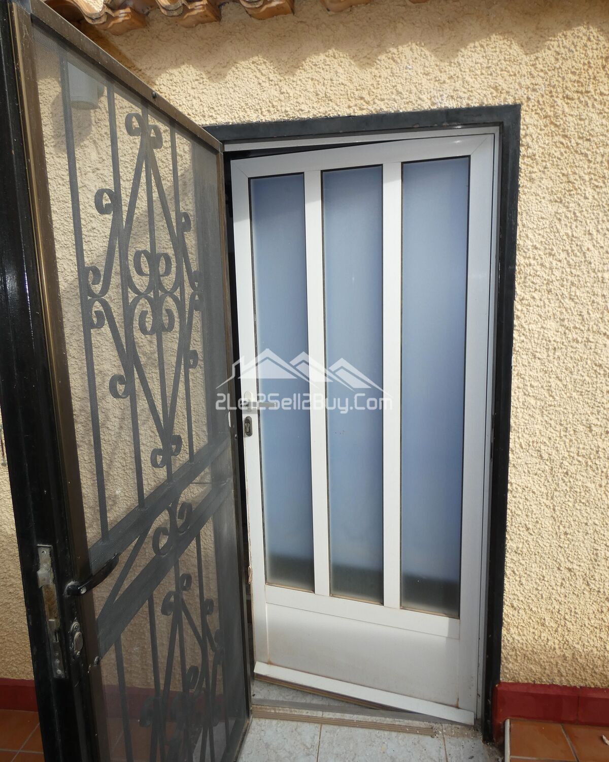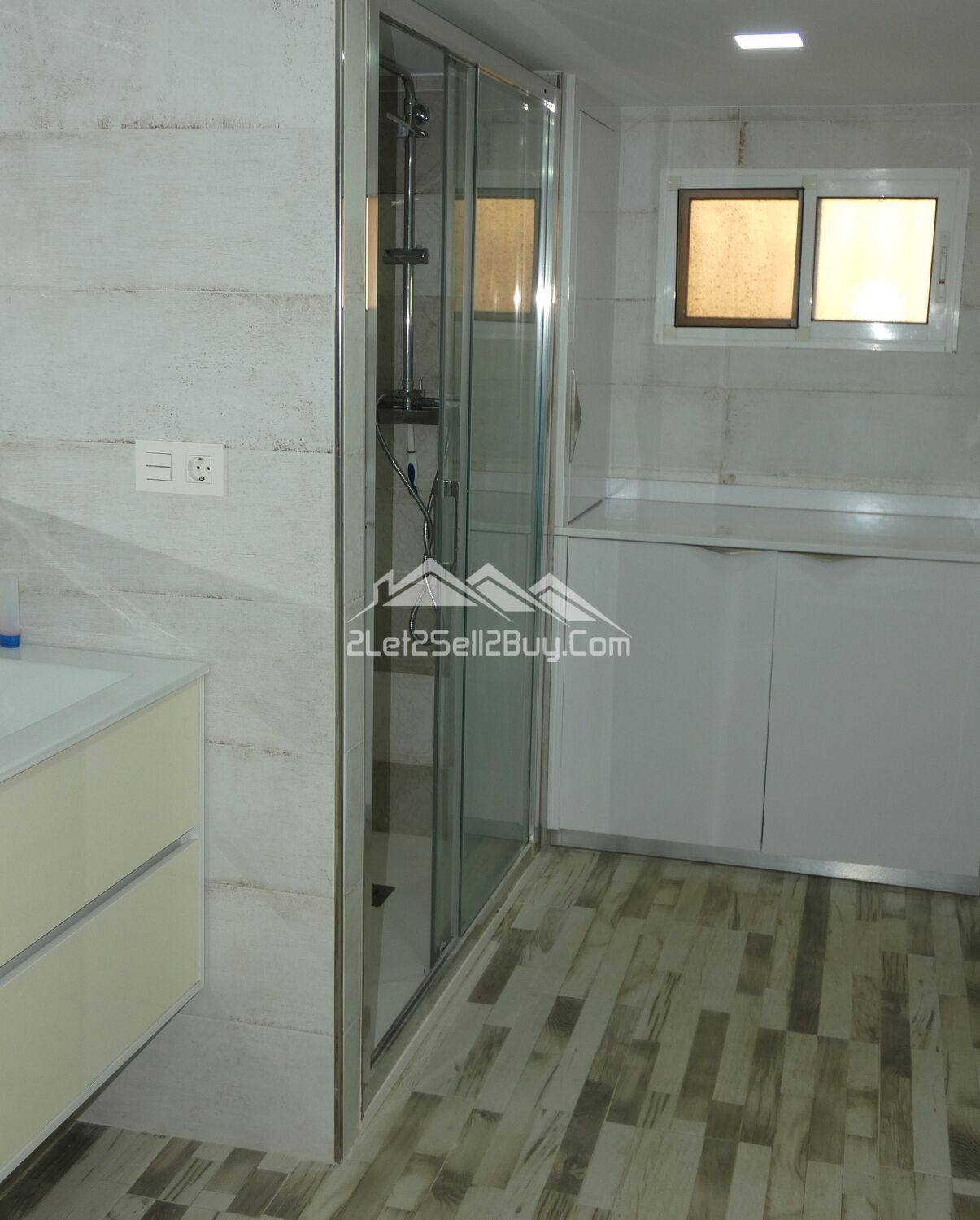 To the left of the shower room, a traditional Spanish wooden door opens onto a spacious double bedroom, featuring a wall-mounted radiator and wall lighting, with ample space for free-standing furniture. An eye level window looks onto the pool area