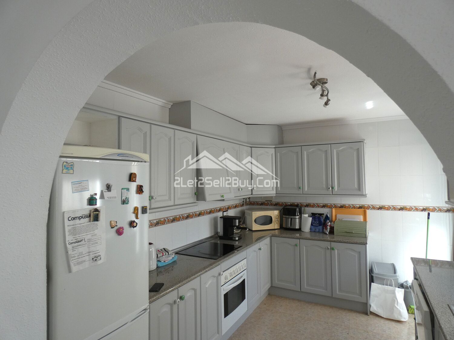 The kitchen features a good range of base and wall mounted units with grey coloured doors, fresh white tiled splashbacks complemented by a decorative border, ample workspace, a stainless steel sink, fridge freezer, electric oven, electric hob, dishwasher, washing machine, a window providing natural light and ventilation and a partially glazed door opens onto to a marble external staircase with metal handrails and decorative balustrades leading up to the third bedroom.