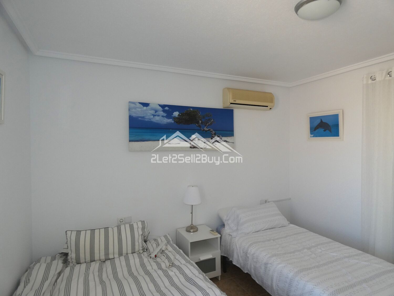 The second bedroom is a generously sized double, currently presented as a twin, with two built-in wardrobes and overhead storage offering a practical storage solution, featuring dual A.C, ensuring year-round comfort and a window with blackout blind and reja looking to the rear of the property.