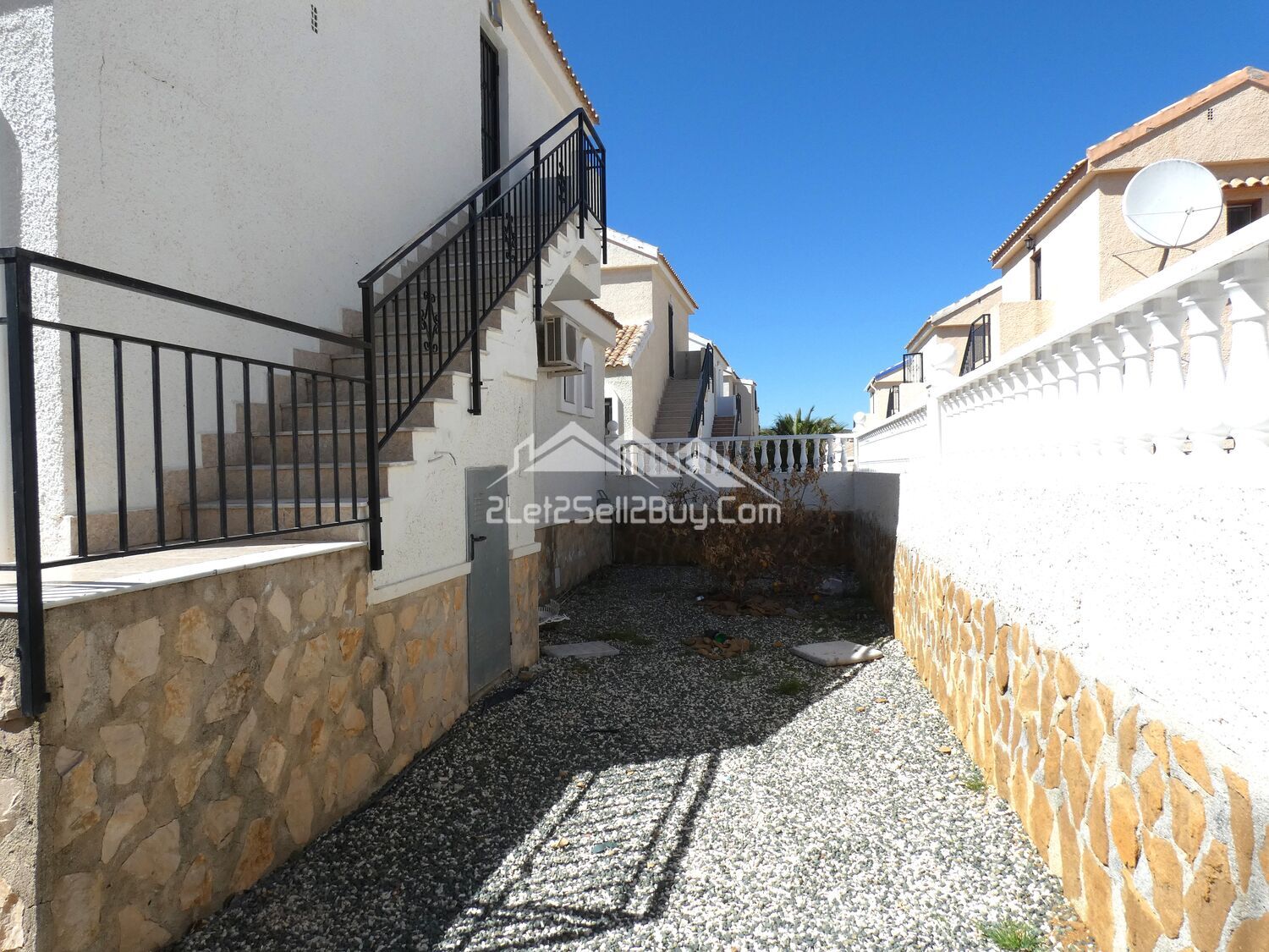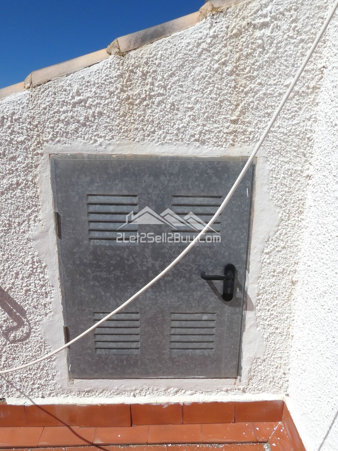 To the rear of the villa, there is a wall-mounted gas boiler and a metal door providing access to the underbuild.
